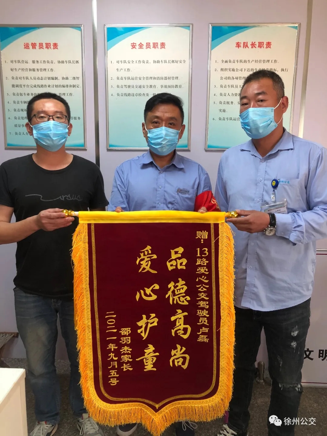9月8日,市民邵先生來到京徐巴士公司,送來了一面印有“品德高尚,愛心護(hù)童”的錦旗,感謝13路駕駛員盧磊的愛心善舉。