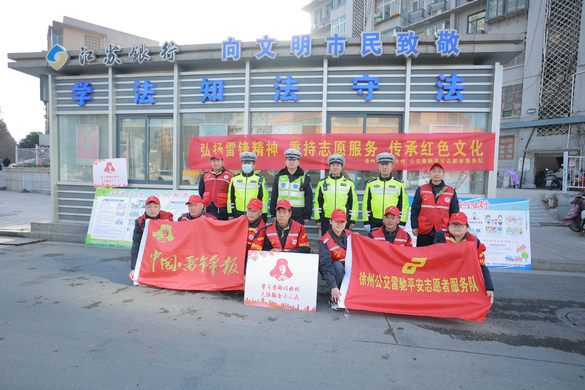 32日早上出行早高峰時(shí)段,徐州公交雷馳平安志愿者服務(wù)隊(duì)組織隊(duì)員們,協(xié)同交警一起在復(fù)興路與銅山路繁華交叉路口疏導(dǎo)交通。
