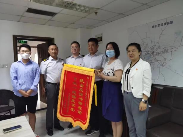 7月28日上午,泉山區(qū)段莊街道紡西社區(qū)書(shū)記余蘭,副主任王艷宇把一面印有“抗擊疫情沖鋒在前,下沉一線保民平安”的錦旗送到公交集團(tuán)。
