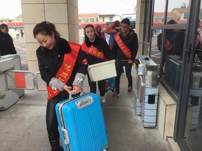 ?xml:namespace>。志愿者們身披綬帶深入各大站點、車場,開展站臺咨詢,導(dǎo)乘服務(wù),主動扶老攜幼,為乘客兌換零錢,共發(fā)放乘車指南1000余份,深受乘客歡迎。圖為賈汪公司志愿者在幫助江蘇安全技術(shù)職業(yè)學(xué)院開學(xué)返校的學(xué)生運送行李。