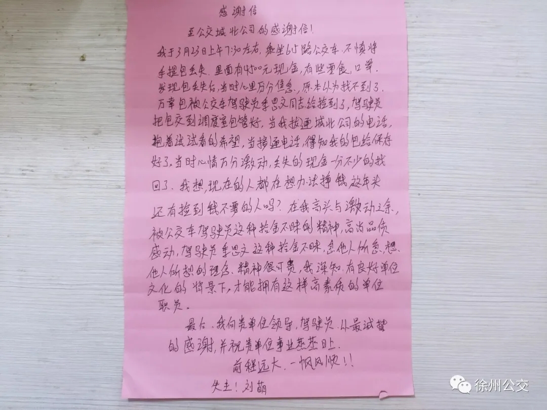 前幾日,市民劉女士在二十四中乘坐615路6952車前往城建家園,上車后,劉女士將隨身攜帶的手提包放在了座位上,下車時有些匆忙,將手提包遺忘在了車上。駕駛員季恩文到食品城公交首末站打掃衛(wèi)生時,發(fā)現(xiàn)了劉女士丟失的手提包。由于已經(jīng)到了發(fā)車時間,季師傅將包收好,到達劉灣調(diào)度室后交給了工作人員。經(jīng)檢查,包里有4500元現(xiàn)金、駕駛證、身份證等重要物品,此時,發(fā)現(xiàn)手提包丟失了的劉女士也撥打了服務熱線,得知她的物品已被妥善保管后,劉女士十分激動。當天下午,劉女士拿回失物并特意寫了一封感謝信表達對季師傅的感激之情。