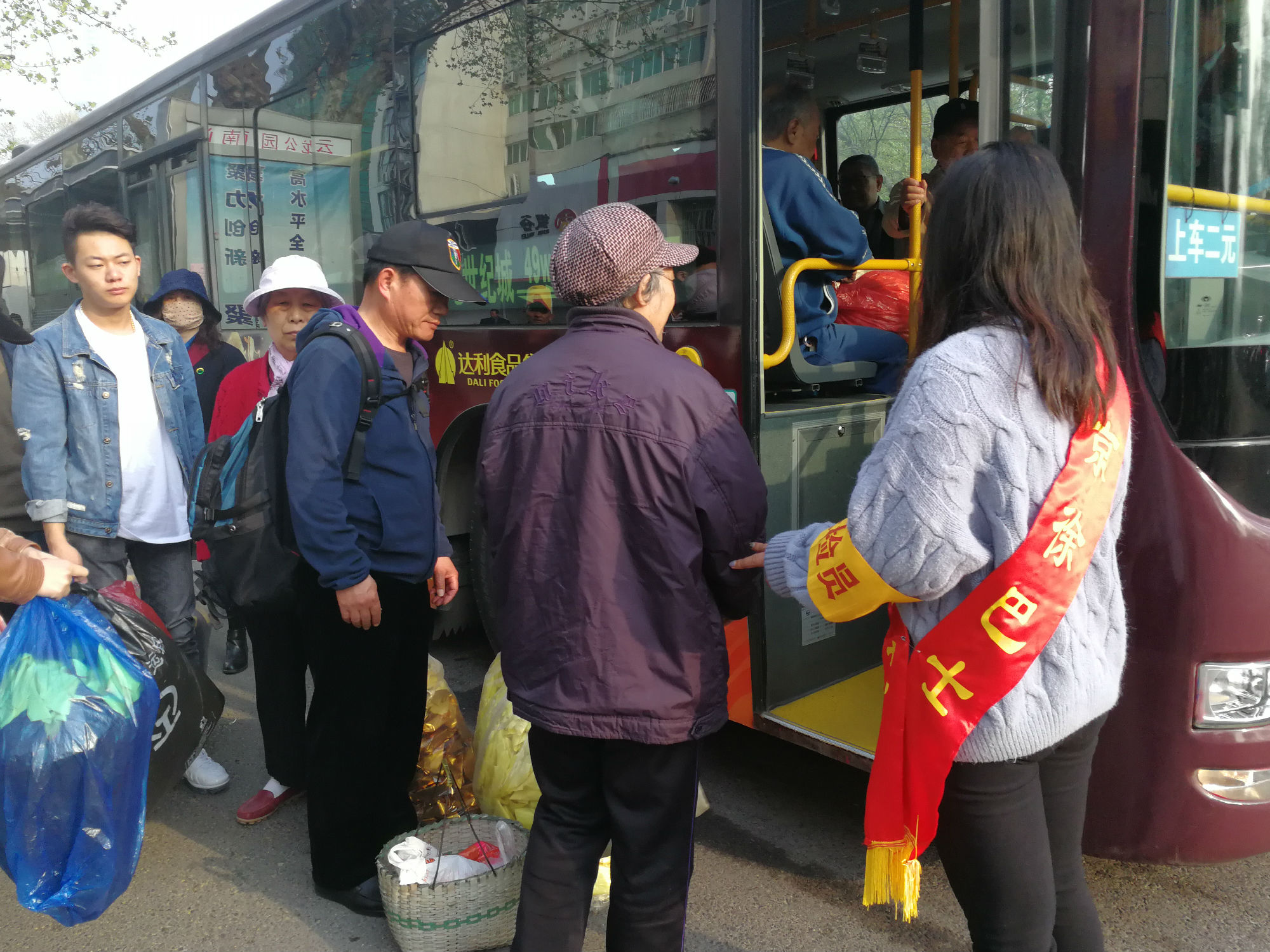 云龍公園南門,站滿了拿著大包小包的乘客?!按蠹遗藕藐牐⒁獍踩?,不要擁擠,需要換零錢的乘客可以到零幣兌換處換取零錢?!敝驹刚呶⑿χS持現(xiàn)場秩序。人群中有位提著兩個大包裹的大媽,志愿者走到大媽跟前,關(guān)切地詢問:“大媽,我來幫您把包裹拿上車吧?!敝驹刚咭皇?jǐn)v扶老人上車,一手拿著物品,為其安排好座位并叮囑大媽注意安全。一班車走后,還沒撈著喝口水,現(xiàn)場又聚滿了乘客,志愿者們又開始忙碌起來:“大爺,車還要一會才能來,您先坐這歇一會吧?!敝驹刚吣脕戆宓剩尷洗鬆斪滦菹?,老大爺十感動,說道:“你們真貼心。